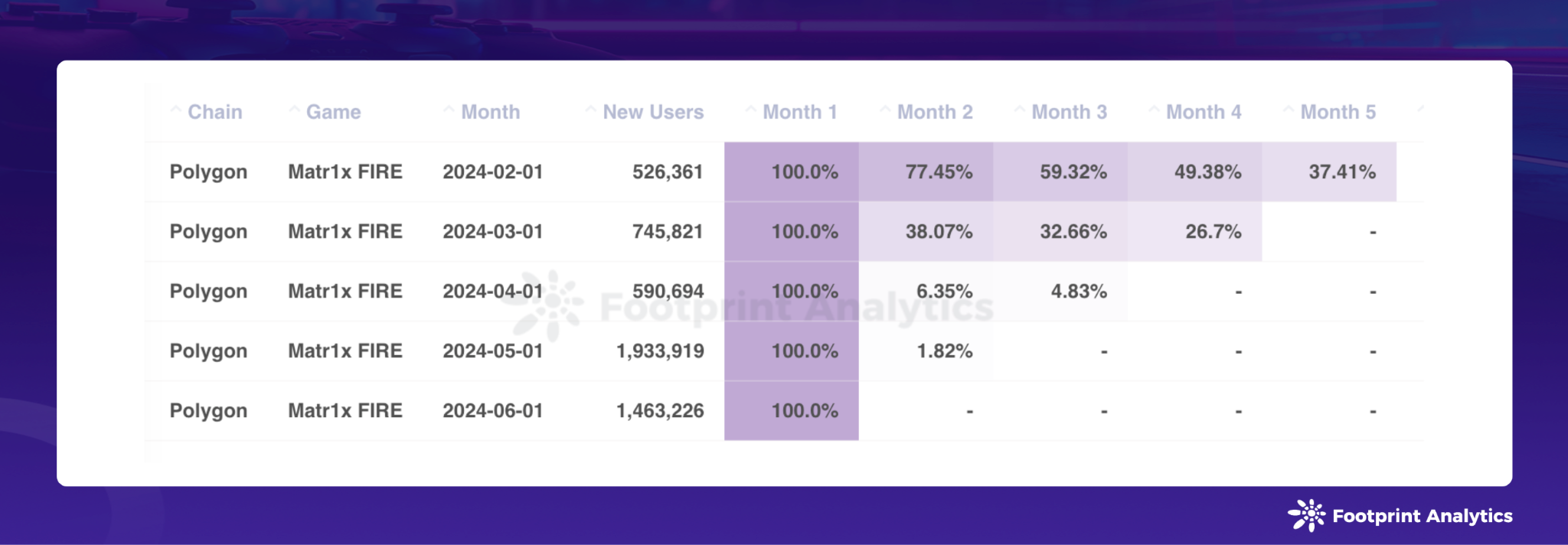 相反,Matr1x FIRE 在四月和五月获得的新用户中,第二个月和第三个月的留存率均不足 10%。该游戏在用户留存方面面临着较大挑战。