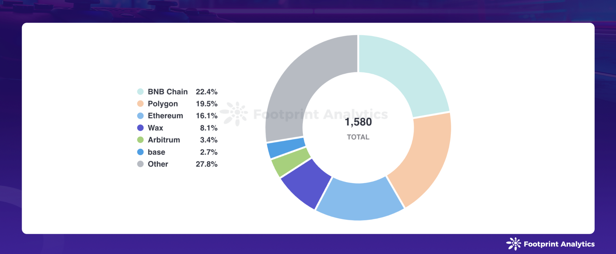 6月,各链上共有 1,580 款活跃游戏。其中, BNB Chain 、 Polygon 和 以太坊 分别以22.4%、19.5% 及 16.1% 的市场份额领先。