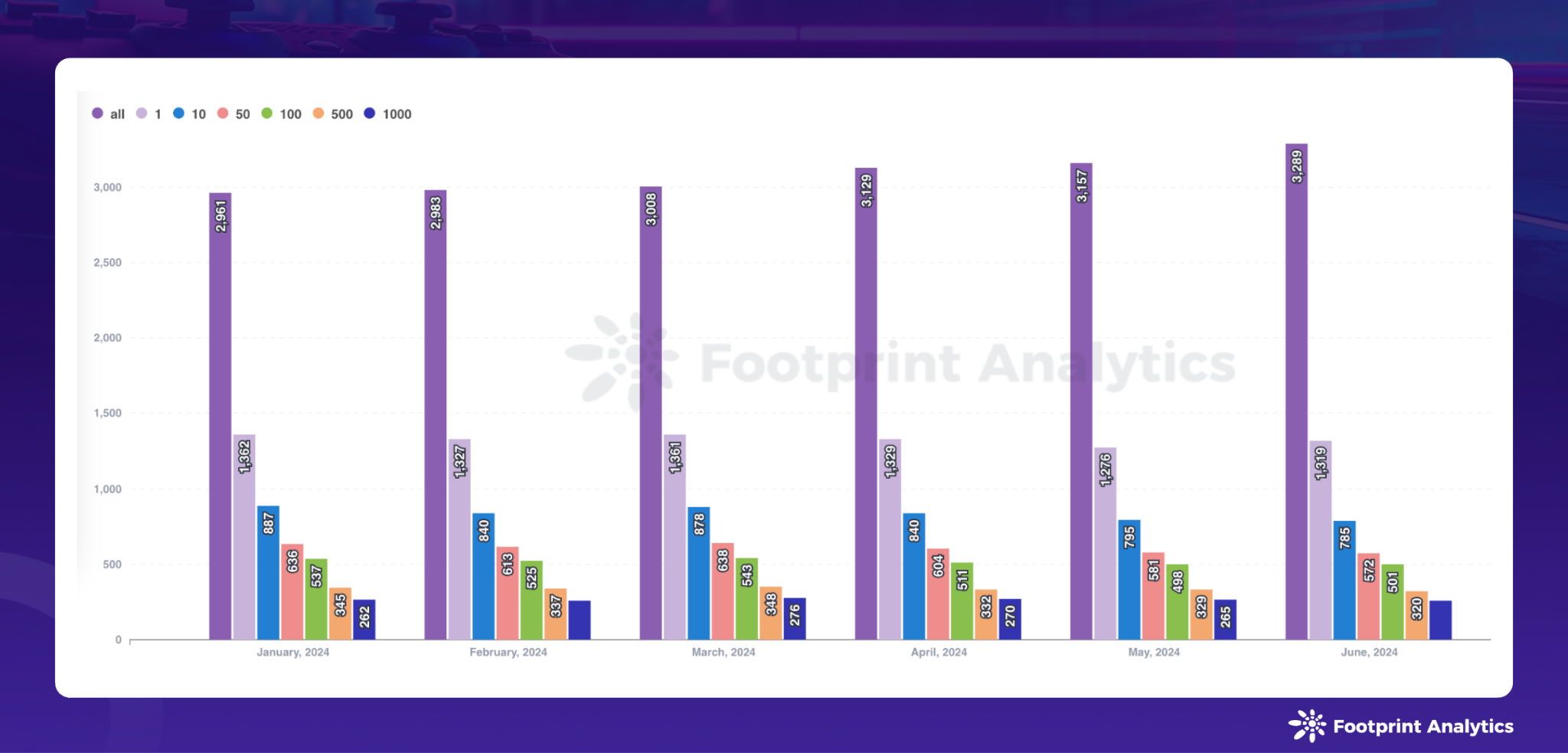 6 月,区块链游戏市场总计拥有 3,289 款游戏,其中 1,319 款保持活跃状态。特别值得一提的是,有 257 款游戏成功吸引了超过 1,000 名的月度链上用户,这一数字占到了所有游戏的 7.8%,同时也在活跃游戏中占据了 19.5% 的份额。