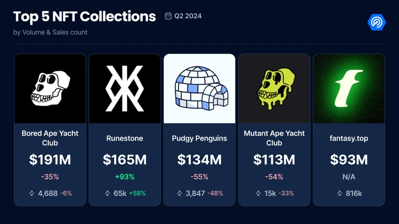 本季度交易量排名前五的 NFT 系列与上一季度基本保持不变,但 Runestone 和 fantasy.top 除外。这两个 NFT 系列在 2024 年第二季度都取得了令人难以置信的成功和人气。