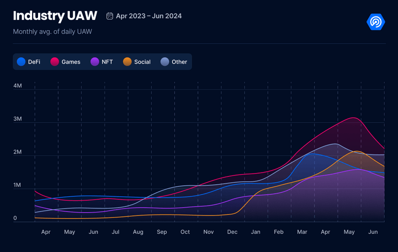 2024 年第二季度对于 dapp 来说是一个非凡的季度,独立活跃钱包(UAW) 数量创下历史新高。现在每天有 1000 万个 UAW 与 dapp 连接和交互,与上一季度相比增长了 40% 。