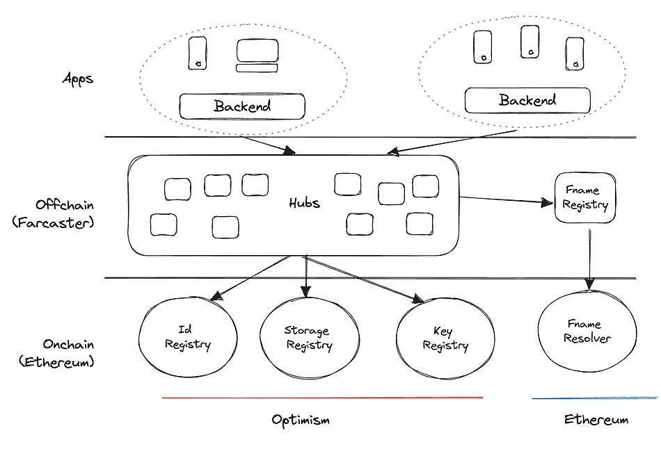 Farcaster:建立在以太坊(L1)上,分为身份层(Identity Layer)管理用户身份、数据层(Data Layer - Hubs)去中心化存储节点管理数据、应用层(Application Layer)提供 DApps 开发平台,并使用离线 Hub 进行数据传播。