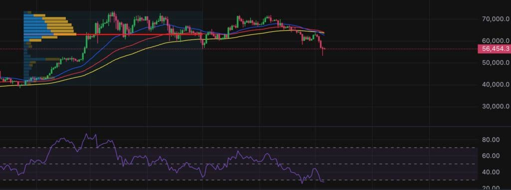 根据成交密集区判断,比特币跌破 5.4 万后的支撑位大约在 5.2 万美元附近,因此不排除当前的回弹还会在二次探底一次。