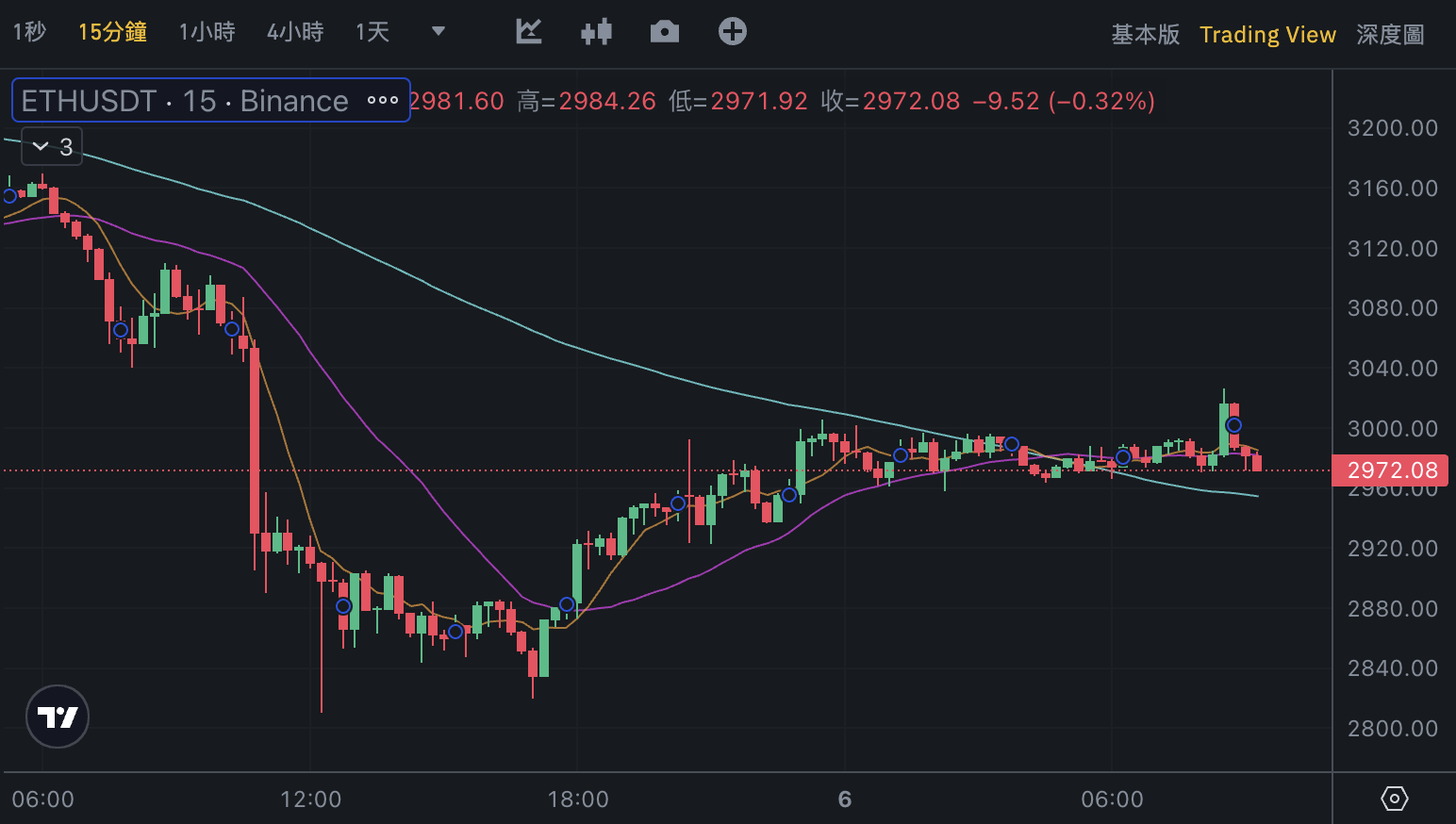 以太坊价格走势与比特币类似,同样自昨日下午 5 点多𫔭始回升,并在今日早上 8 点半来到最高 3026.45 美元,目前仍稳定在 2900 美元上方震盪。