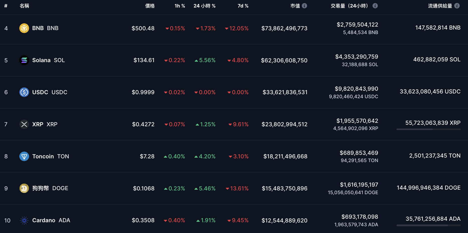 CoinMarkeCap 数据 显示 ,其他前十大代币近 24 小时涨跌不一,但相较昨日跌势都有回血: