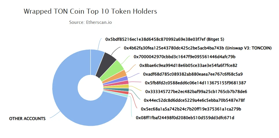 根据 Etherscan 数据,TOP 10 地址持有 29.99% $Toncoin 代币,筹码分配较为松散,市场状态良好。