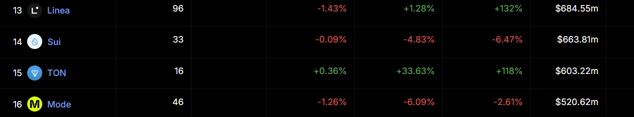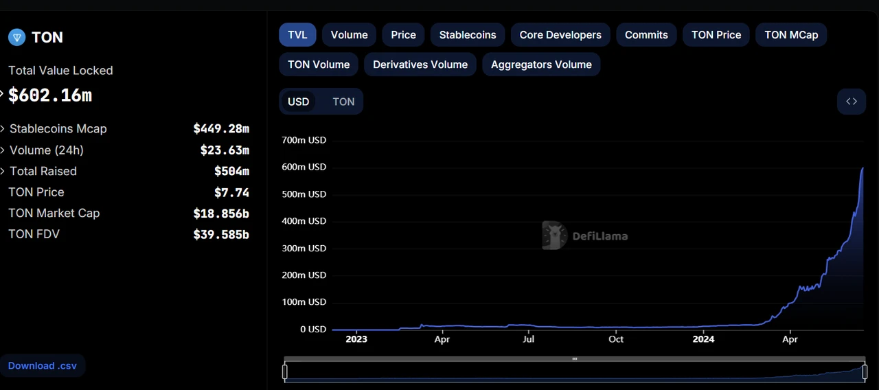 截止至撰稿时间,TON 链市值达 187.59 亿美元,成为第九大加密货币。同时 TON 链 TVL 自 4 月以来增长速度较快,目前达 605.72 m USDT,位列公链第 15 名。显然 TON 链 TVL 增速虽快,但尚未跟上其市值,仍有较大进步空间。