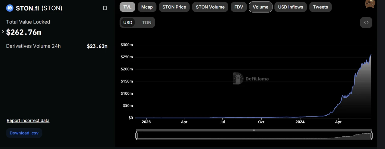 随着 TON 链生态的爆发,STON.fi TVL 自 2 月起出现爆发式增长,目前达到 262.2 m USDT,位列 TON 生态第三名。