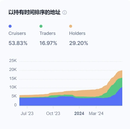 据持有时间分析, 29.20% 的 Holders 持有$Toncoin 超过一年的时间, 16.7% 的 Traders 持有$Toncoin 不超过 1 个月,钻石手比例较高,大众对 TON 前景十分看好。