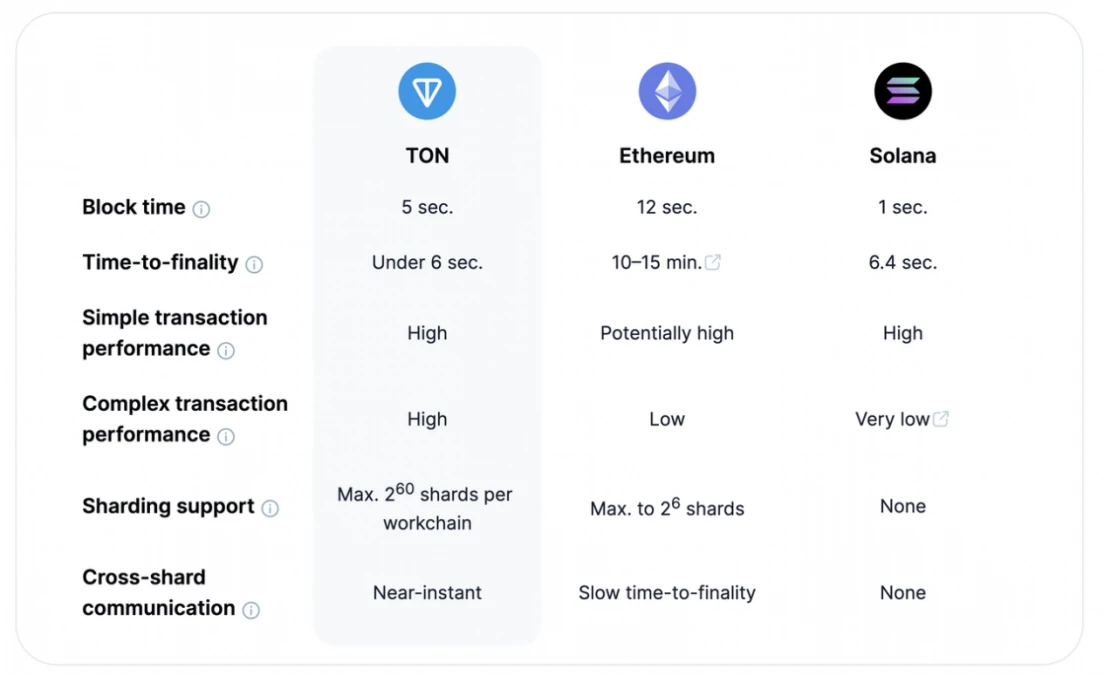虽然智能合约异步调用和分片技术在 Ethereum 2.0、Polkadot 和 NEAR Protocol 等项目中有所应用,但是 TON 将多种技术融合,在多项指标如交易确认时间(Time-to-finality)等超越 Ethereum 和 Solana。