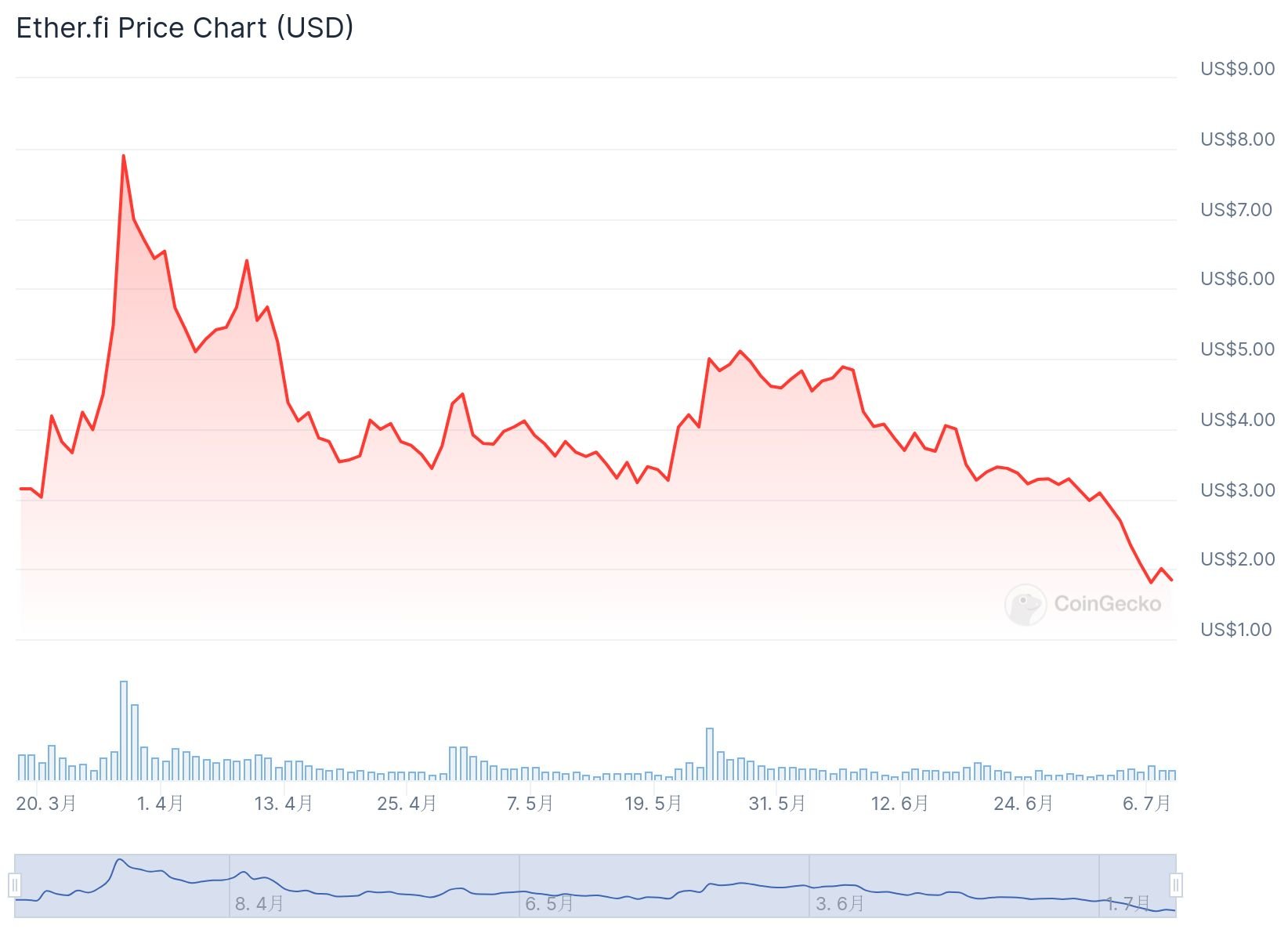 侭管持续推出空投活动,但 ETHFI 近期表现相当低迷,Coingecko 数据 显示,ETHFI 价格过去 30 日跌幅高达 61%,现报 1.85 美元,距离 3 月创下的 8.53 美元历史高点已暴跌超过 78%。