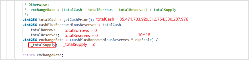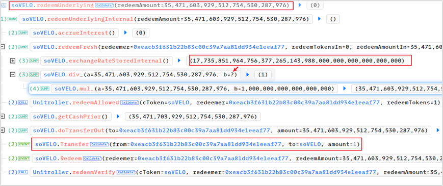 (2)计算精度问题:利用计算过程中的精度损失以及被修改的 exchangeRate,在只抵押了 1 wei soVELO 的情况下,可以赎回 35 M VELO