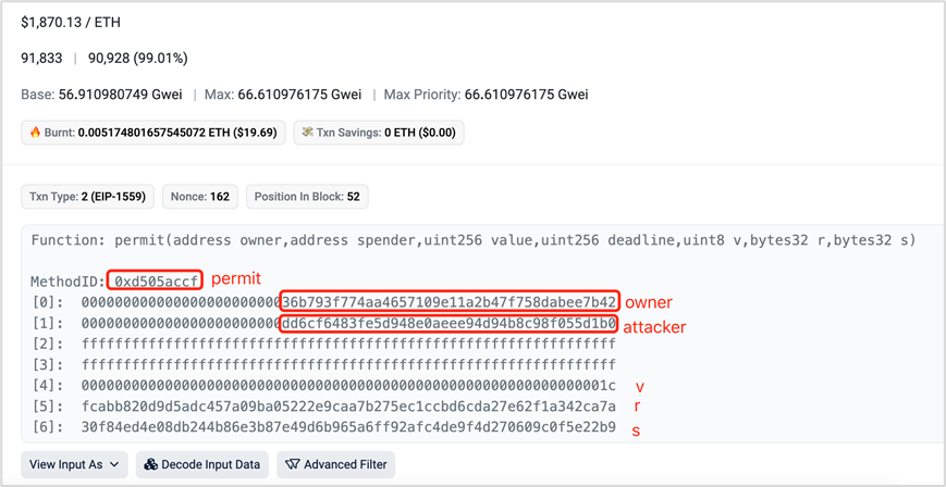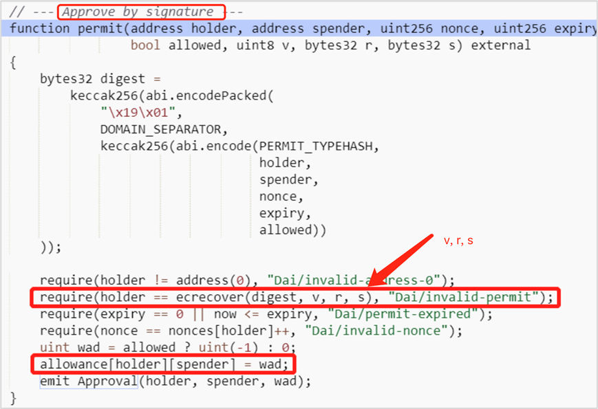 (2)攻击者调用 permit 函数,完成授权。