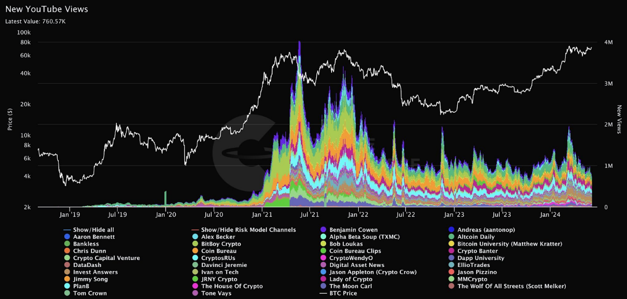 与上一个周期相比,YT 指标降低了约 5 倍。2021 年比特币价值 7 万美元,每天的浏览量为 400 万次。现在,比特币价格为 7 万美元,每天的浏览量约为 80 万次。这表明散户投资者的兴趣仍然很低,还有上涨空间。