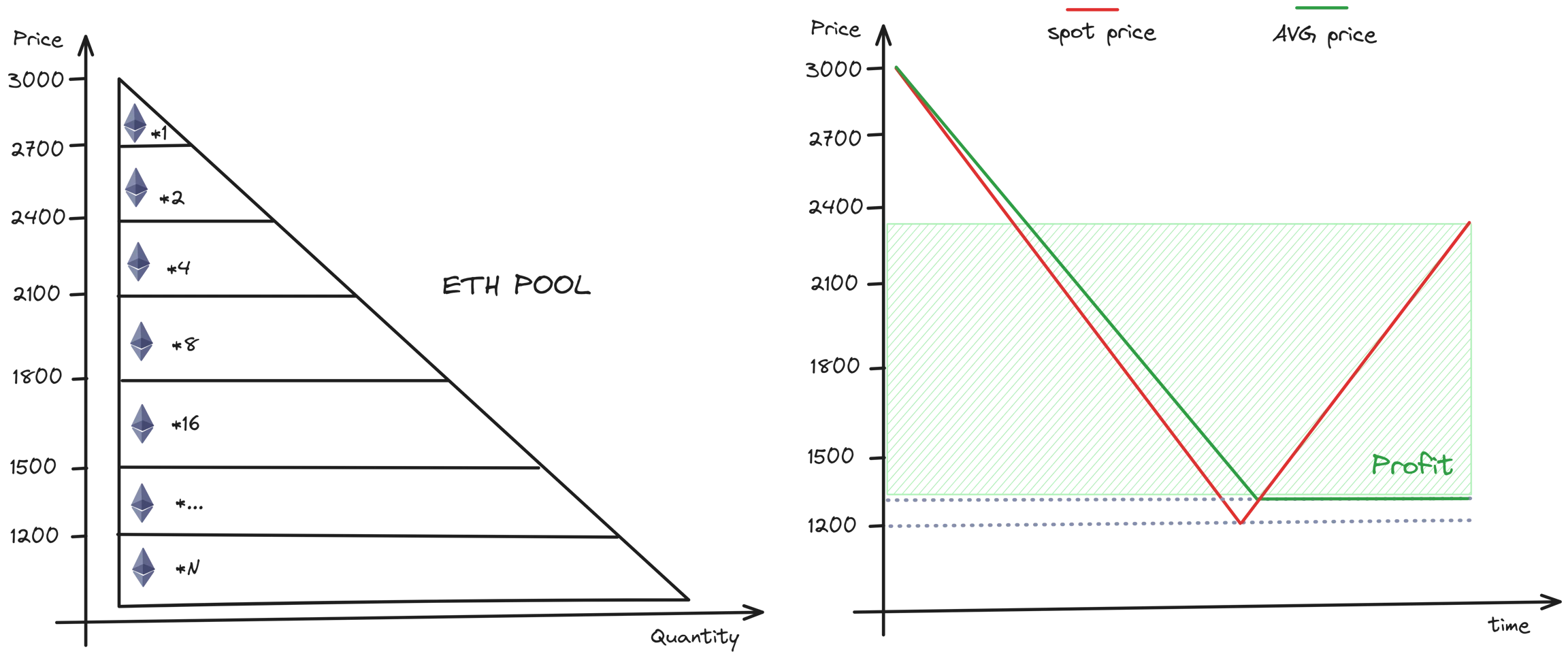 Doubler 将马丁策略用于加密投资中,并通过”集资“的方式解决资金问题,每当标的物下跌一定程度时就注入更多抄底资金,实现均价的快速下降。在最新版的 Doubler Lite 中,不限制具体的抄底点位,而是通过激励机制由市场自行调整购入价格。