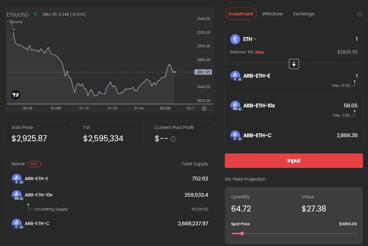 在 Investment 模块投入 ETH,获得 C 代币、E 代币、10x代币(池子浮盈情况下不获得);