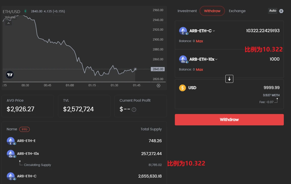 而 Doubler 设定的规则是,用户需要按照代币池中实际的10x和 C 比例,提交相应的两种代币方可提取 ETH。如下图所示,当前总池子内的 C:10x为 10.322 ,因此赎回时也需要同比例的两种代币。而赎回价值则为(赎回代币量÷总量×TVL)= 1000 ÷ 257272 × 257272 = 10000 美元。