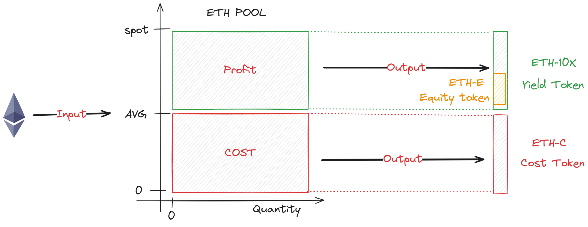 在 Doubler Lite 中,对于注入资金池的资产,协议将成本、收益的所有权分离为成本代币和收益代币,代表成本所有权的代币是 C 代币,而代表收益的代币是10x代币,并加入了 E 代币,能够单向转化为10x代币。