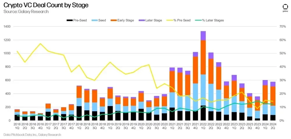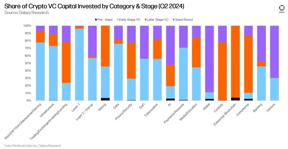 2024 年第二季度, 78% 的资金分配给了处于融资早期的公司, 20% 则分配给了处于融资后期的公司。尽管专注于加密货币的早期风险投资基金十分活跃,且手握 2021 年和 2022 年留下来的储备资金,但大型综合风险投资公司似乎已经退出行业或大幅缩减活动,使得处于融资后期的创业公司更难筹集资金。
