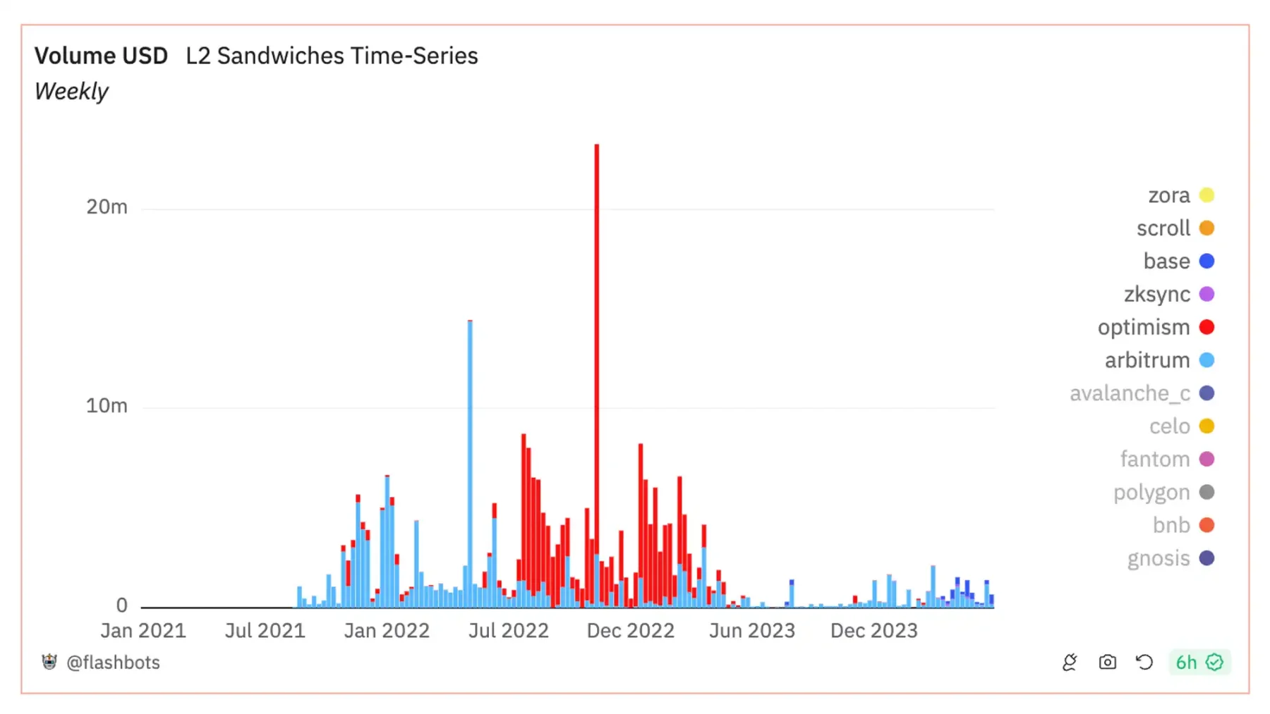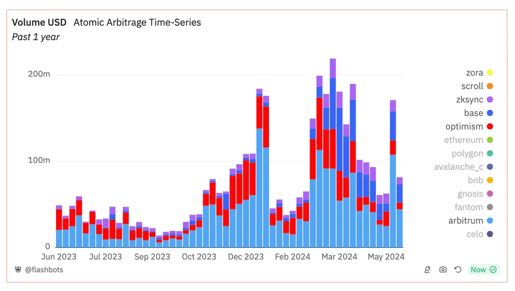 在过去一年里,六个主要 L2 包括,Arbitrum,OP Mainnet,Base,Zora,Scroll 和 zkSync 上的原子套利 MEV 交易量超过了 360 亿美元,这占到了每个链上所有去中心化交易所(DEX)交易量的 1% 到 6% 。这些 MEV 交易量最初主要集中在 Arbitrum 和 OP Mainnet 上,但最近已经逐渐转向 Base 和 zkSync。