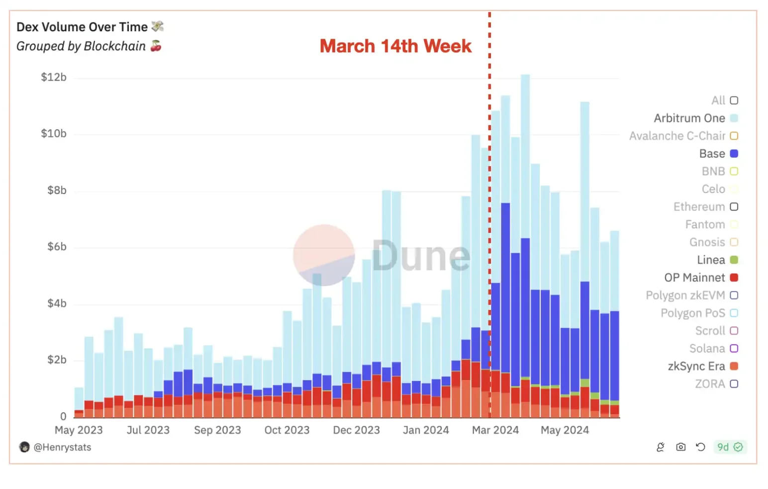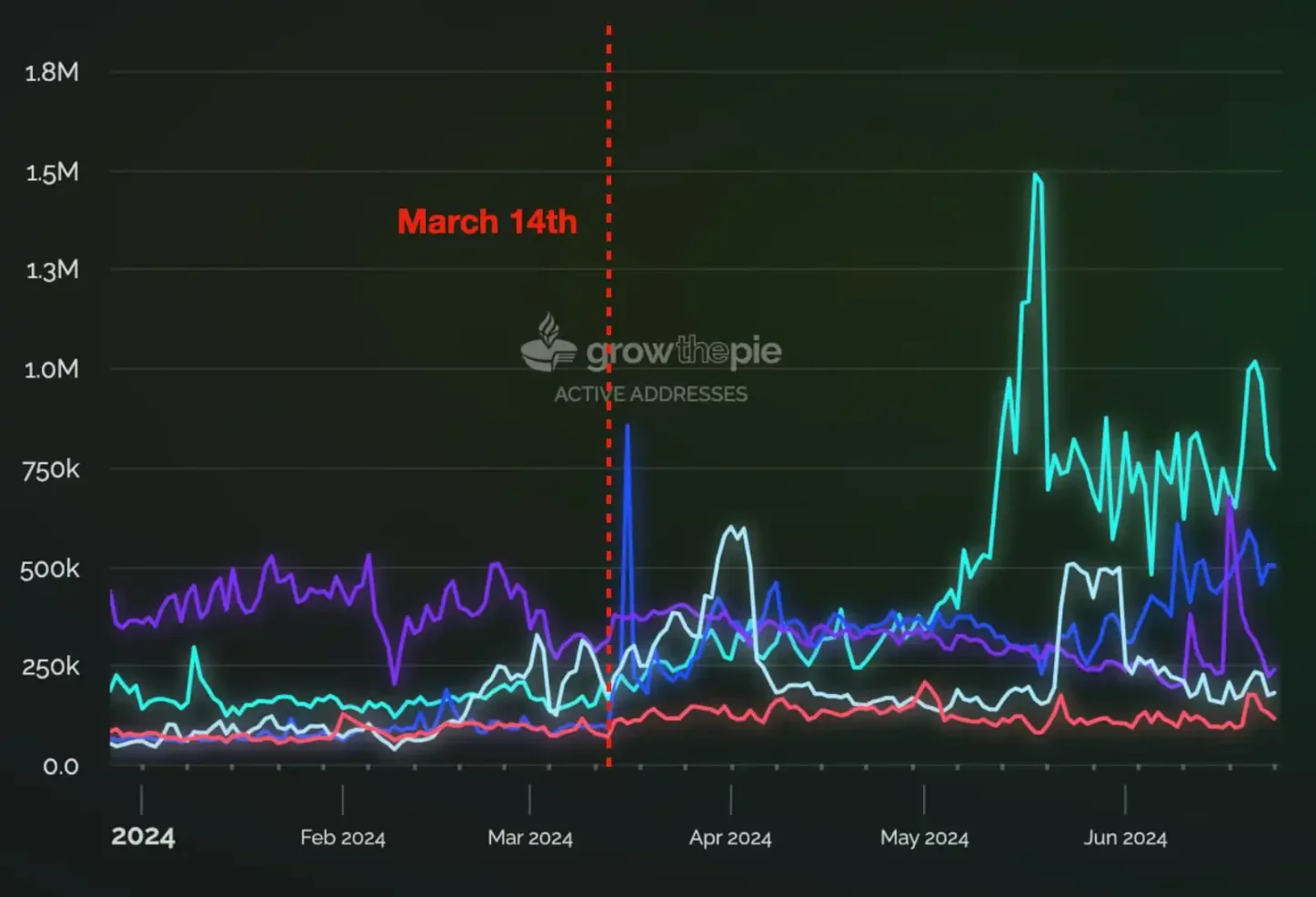 尽管很难确定这是有机参与的结果还是受到激励计划和 Sybil 活动的影响——但自去年年底以来,随着市场条件的改善和由 Solana 上的 WIF 引发的 memecoin 季节的到来,所有主要 L2 上的活跃地址和 DEX 交易量都明显在 EIP-4844 升级后增加,特别是在 Base 和 Arbitrum 上。