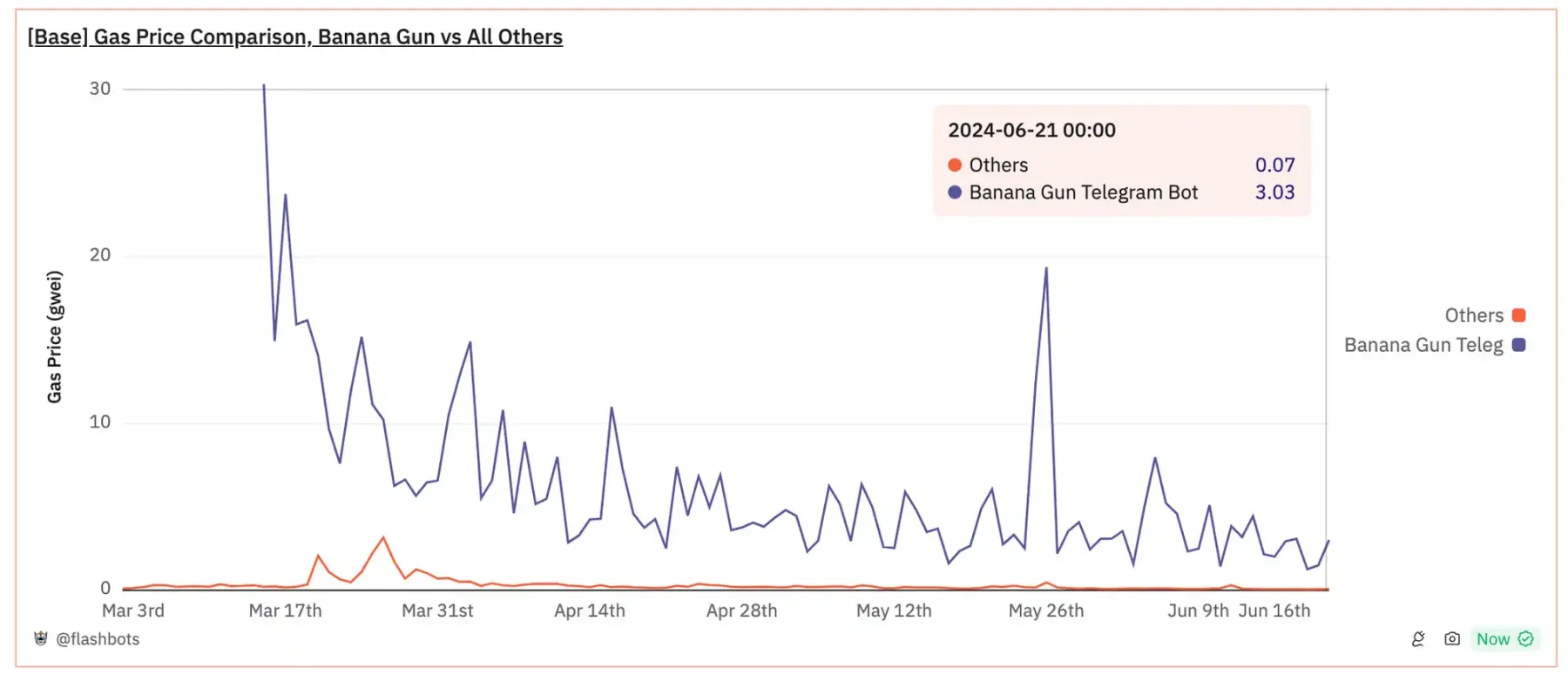 通过比较流行的 Telegram Bot 的行为,如 BananaGun,可以明显看出,它们进行的交易产生的 gas 费用远高于普通交易。在 Dencun 升级之后,使用 BananaGun Telegram 机器人的用户在 Base 网络上执行交易时,gas 价格一度飙升至 30 Gwei 的峰值。尽管这一费率随后稳定在大约 3 Gwei,但仍然是其他交易所需支付 gas 费用的 43 倍。