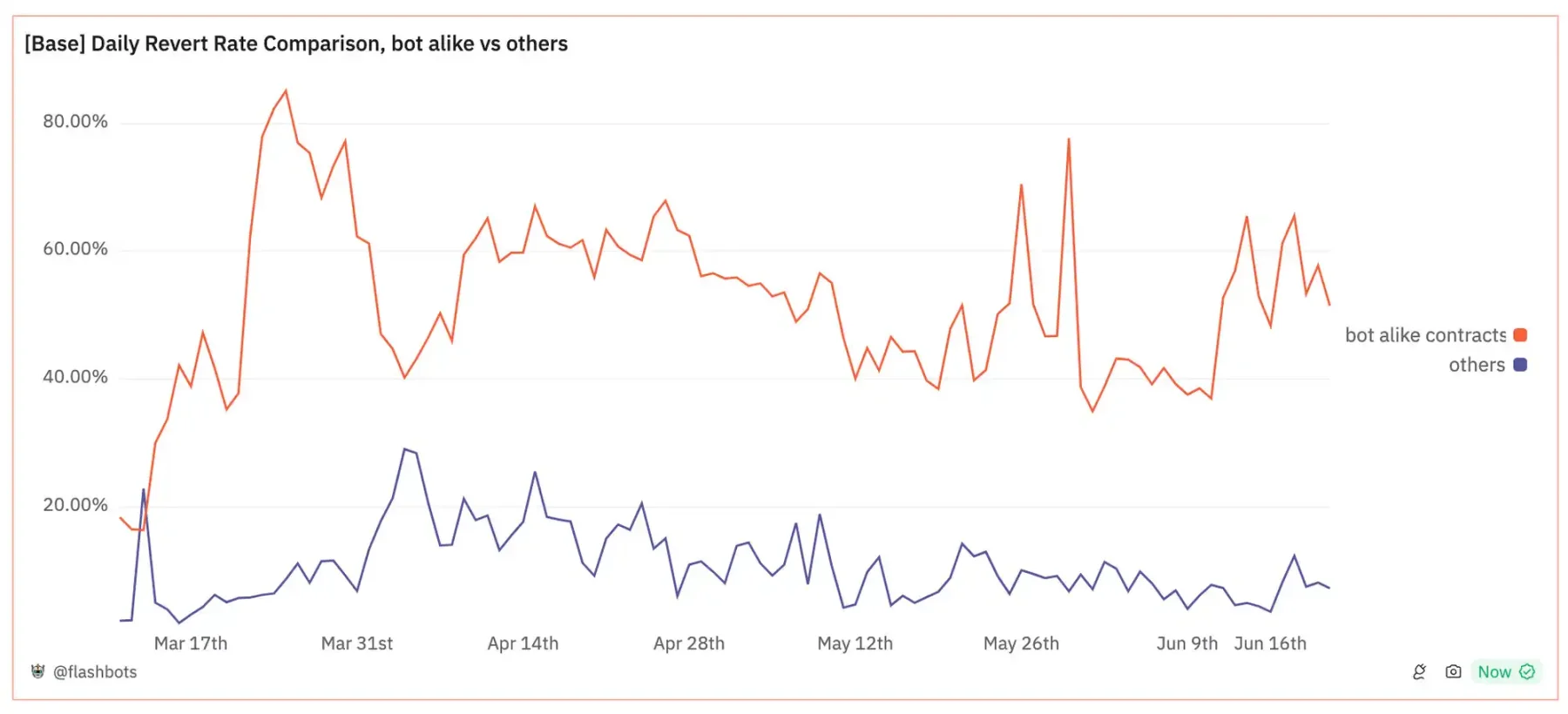 根据上述数据,我们可以推断,像 MEV 机器人和 Telegram 机器人这样的自动化交易活动,很可能是导致 Base 网络上高 gas 费用和高回滚率的主要原因之一。