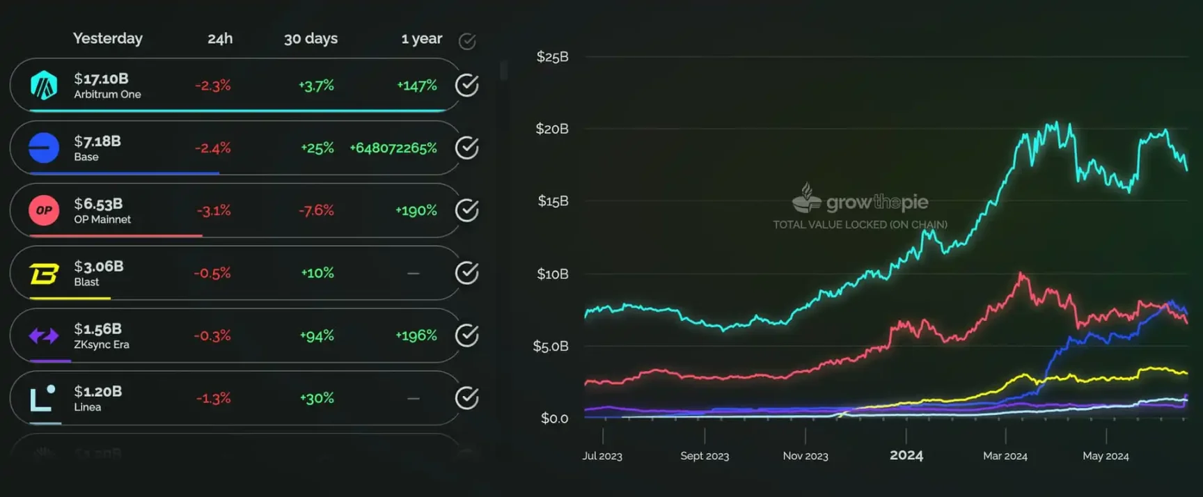 随着市场条件的改善和由 Solana 上的 WIF 引发的 memecoin 季节的到来,自去年年底以来,L2 上的 TVL 持续上升。值得注意的是,Base 已成为增长最快的链,最近的总 TVL 还超过了 OP Mainnet。