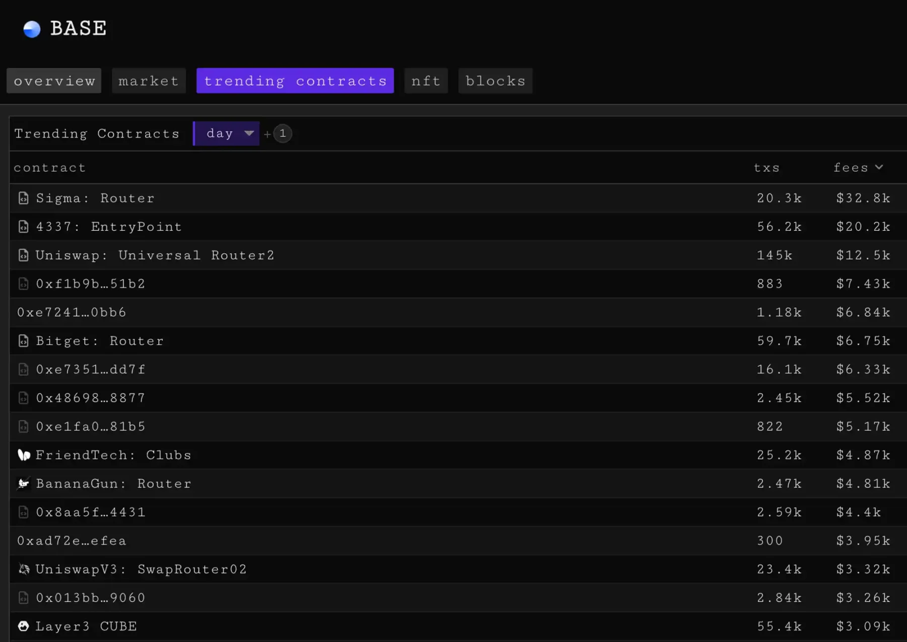在 Base 网络上,消耗 gas 最多的合约包括 Telegram 交易 BotSigma 和 Banana Gun,以及数字钱包和 DEX,例如 Bitget 和 Uniswap。除此之外,还有许多未标记的合约参与了代币铸造、meme 币交易和原子套利等活动。这些合约是 Base 网络上按 gas 费用支付排名的顶级合约。