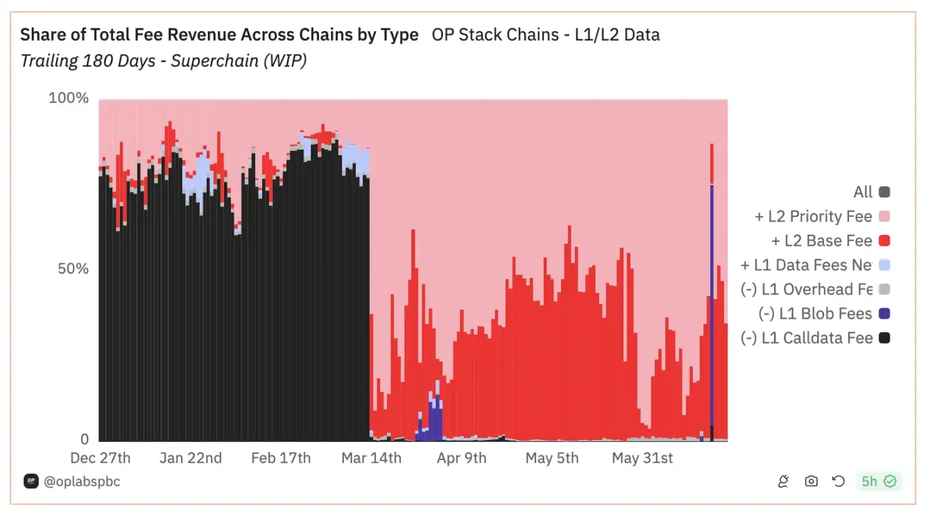 从历史上看,以太坊 L1 的费用构成了用户在 L2 上交易时所需支付的总费用的大部分,占成本的 80% 以上,如下图中的黑色条所示。然而,在 3 月 14 日的 Dencun 升级之后,L2 从使用 calldata 转变为一种更为经济的方法,即所谓的「blobs 1 」,用于向 L1 提交批次。这种临时存储包含自己的 gas 拍卖,由 blob 基础费用和优先级费用组成。