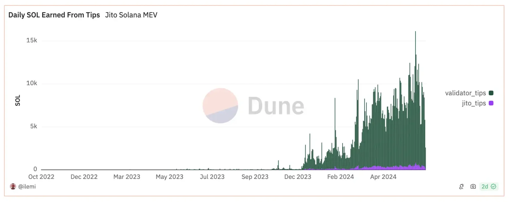 在 Solana 上,验证器通过 Jito 的捆绑服务从验证器提示中收集的额外 MEV 收入,基于每周 50, 000 SOL,预计约为 3.38 亿美元(根据 130 美元 /SOL 的价格估算)。