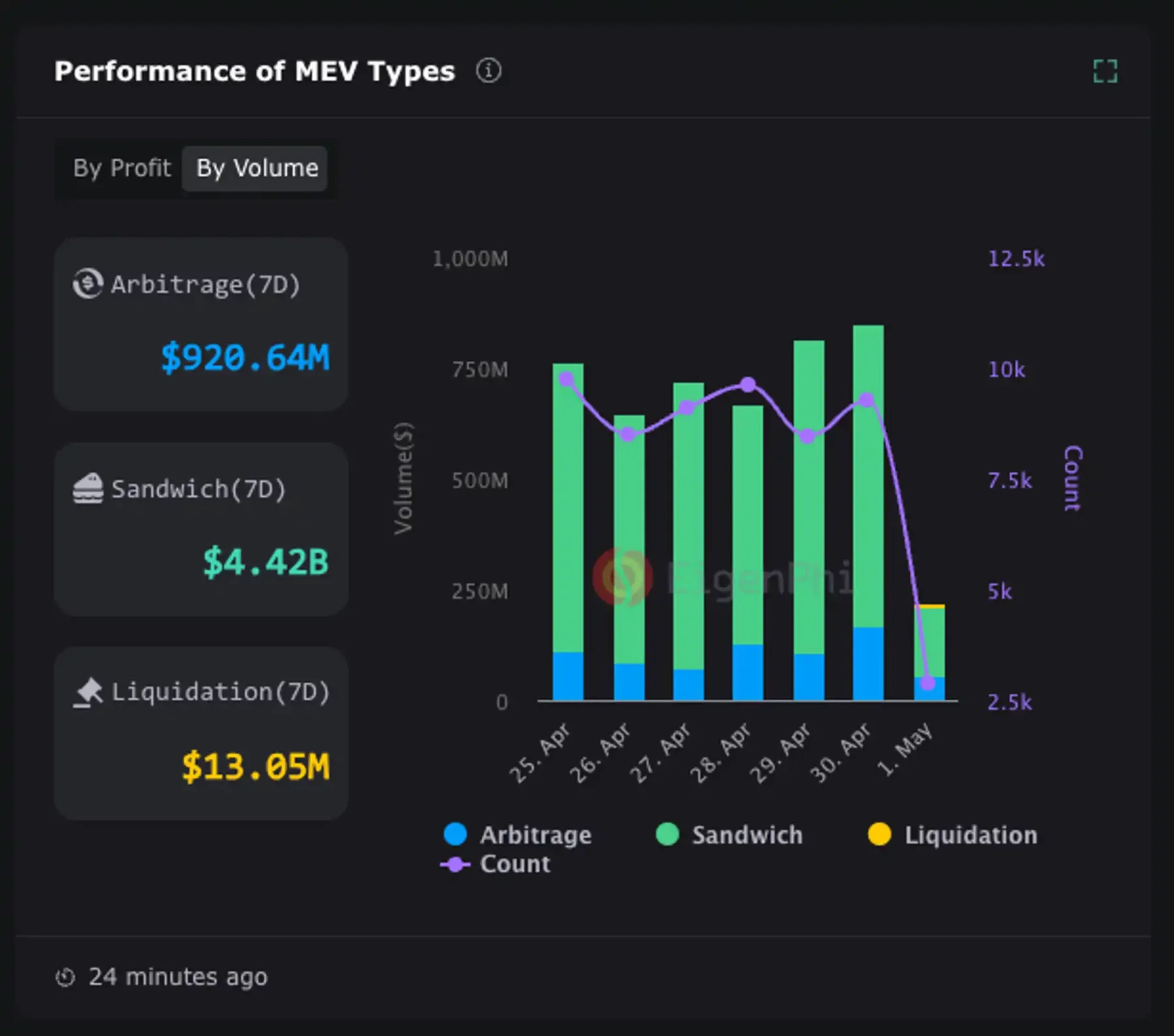 与原子套利交易量相比,L2 网络上的三明治攻击交易量明显较少,这与以太坊形成了鲜明对比,在以太坊上,三明治攻击的交易量是原子套利的四倍。这种差异主要是由于 L2 网络采用单一序列器的设置,并没有交易池,这限制了搜索者利用交易池中的用户交易来执行三明治 MEV 的能力,除非出现交易池数据泄露或者单一序列器发起的三明治攻击。因此,在 L2 上,原子套利、盲回跑、统计套利和清算成为了对搜索者来说更可行的策略。