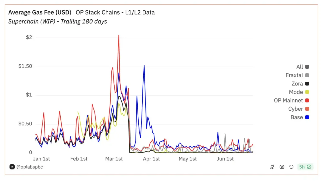 自 Dencun 以来,L2 支付给 L1 的费用有了显著的减少——图表显示 OP Stack 链的 gas 成本分解发生了重大变化,L1 成本从 90% 骤降至仅 1% ,而 L2 成本现在占总成本的 99% 。这一转变导致 L2 上的平均总 gas 费整体下降了大约十倍,例如 OP Mainnet 的平均 gas 费从每笔交易约 0.5 美元暴跌至 0.05 美元。