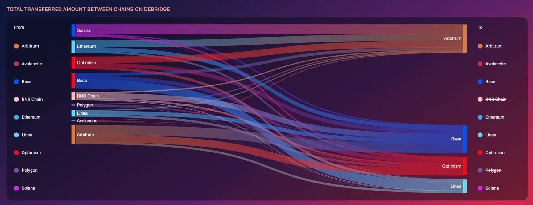 自 3 月初以来,Base 流入大约 15 亿美元的 USDC,其中一部分是 Coinbase 将客户和企业的资金转移到 Base 上。根据 Artemis 自 2024 年 1 月以来对 11 个主要桥的数据,从以太坊到主要 L2 有 140 亿美元的流出。Arbitrum 以约 70 亿美元领先,紧随其后的是 zkSync、Base 和 OP Mainnet。根据 Debridge Finance 的进一步数据,这是一个在 EVM 链和 Solana 中广泛使用的跨链桥,并且证实了 Arbitrum 和 Base 是所有资金流出的顶级接收者。