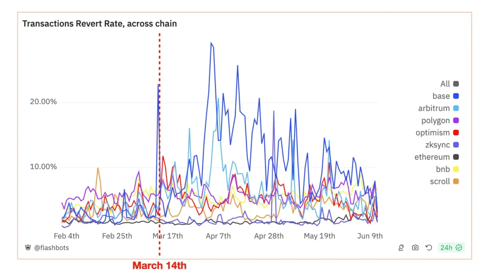 当我们进一步检查交易时,我们注意到 Bot 交易活动正在提高 L2 上的 gas 费和回滚率。我们将在下一部分通过使用 Base 的统计数据进行案例研究,更全面地探讨这个问题,突出显示 Dencun 升级后 L2 上更便宜的 gas 的影响。