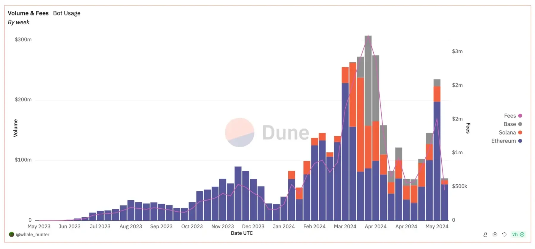 尽管 Base 网络的确切 MEV 总量尚未公布,但我们可以通过观察 Banana Gun Telegram Bot 的收入来对市场规模进行估算,该 Bot 是市场上最活跃的参与者之一。Banana Gun 在 Base 的 L2 网络以及 Solana 上的交易量大致相同,每条链都能带来超过 100 万美元的日交易量,相当于每条链每天产生超过 10, 000 美元的交易费用。