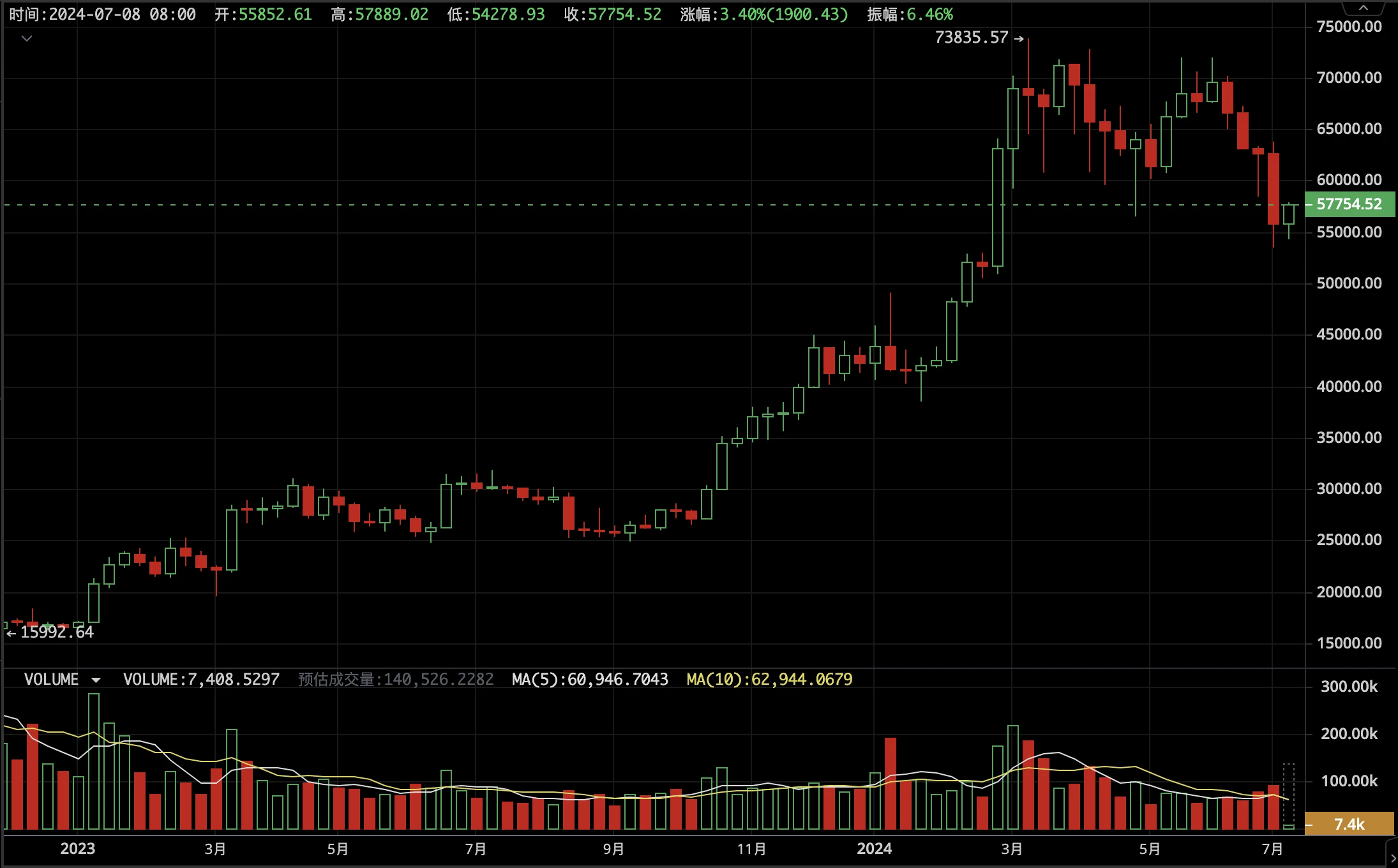BTC 上周调整幅度加大,跌幅 10.87% ,振幅 16.44% ,放量跌破新高整理区间。最低点的 5.34 万美元,距离最高点已经下跌近 28% 。关于牛市是否还在的疑虑进一步加强。