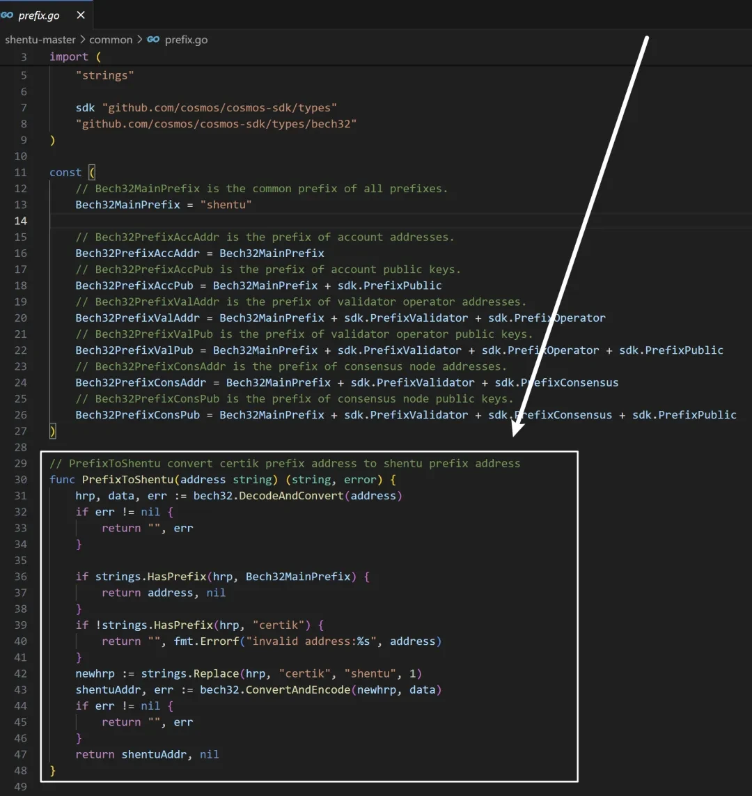 但阅读过 SHENTU 的源码后发现了一段替换前缀的代码,将 CertiK 的前缀替换为了 SHENTU 的前缀,虽然在开发上是可以理解的,只是为了方便调整而进行域名替换,但的确会给人一种 CertiK 既当裁判又当运动员的感觉。