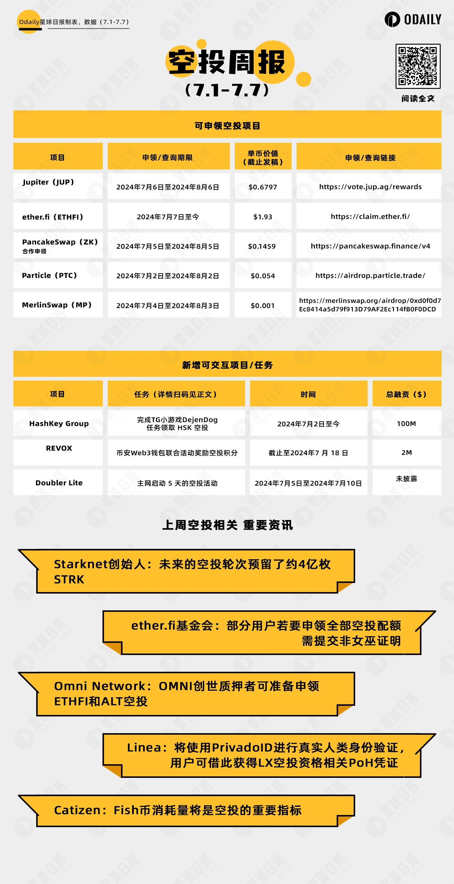 Odaily 星球日报盘点了 7 月 1 日至 7 月 7 日期间的空投可申领项目(如下图),同时整理介绍了上周新增的可交互项目/任务和重要的项目发言,详细信息见正文。