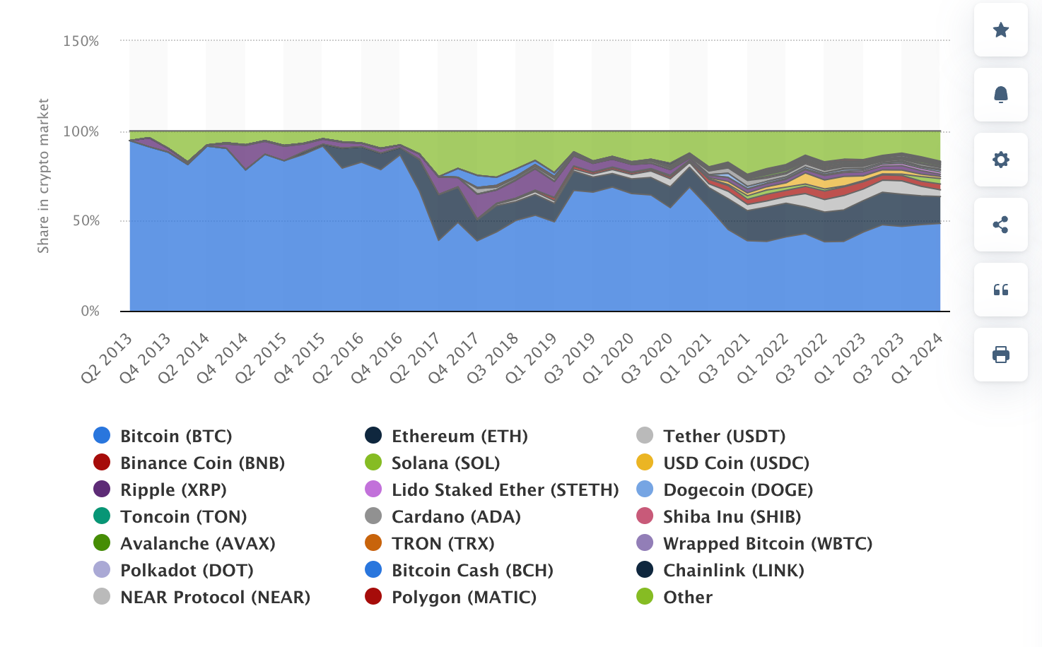 Pic: Dominance of Bitcoin and other crypto in the overall market from 2nd quarter of 2013 to 1st quarter of 2024