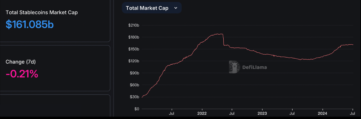我们选取稳定币去深入看加密市场的需求。因为稳定币发行机制决定了其发行就可以代表是市场对加密市场的需求。在稳定币的整体市值上,自2024年至今(约半年)上涨了约300亿美元。和2021年下半年、2022年上半年相比,增长速度明显减少。更何况2021年到2022年上半年正好是全球金融市场流动性紧缩的时刻。这也就是说,加密市场也从之前的对冲风险市场,已经变成了这汪洋大海的一叶扁舟了。