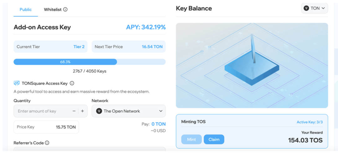 KEY是一种代表公链运营节点的NFT,激活节点后可产出代币TOS,收益率约350%。KEY未来收入还包括跨链桥费用和新公链的Gas分成。生成的TOS还可以质押,质押从24年6月底开始持续6个月,收益率约300%。