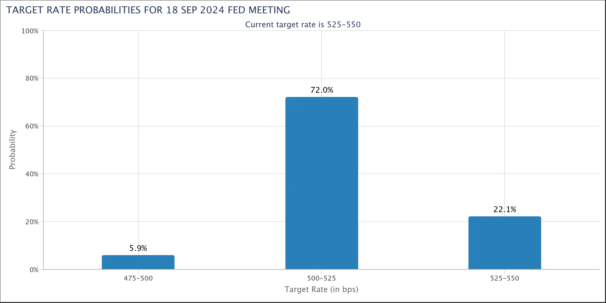 根据芝加哥商品交易所收集的数据,截至 7 月 7 日,华尔街交易员认为美联储降息 25 个基点的可能性为 72% 。一个月前,这一概率为 46.60% 。
