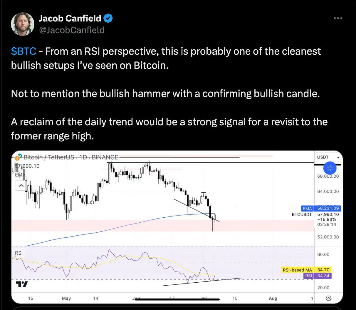 其次,比特币的每日 RSI 读数徘徊在超卖阈值 30 附近,这通常预示着盘整或复苏期。分析师 Jacob Canfield 预测,该指标可能预示反弹,BTC 可能会回到 70, 000 美元以上的「前期高点」。