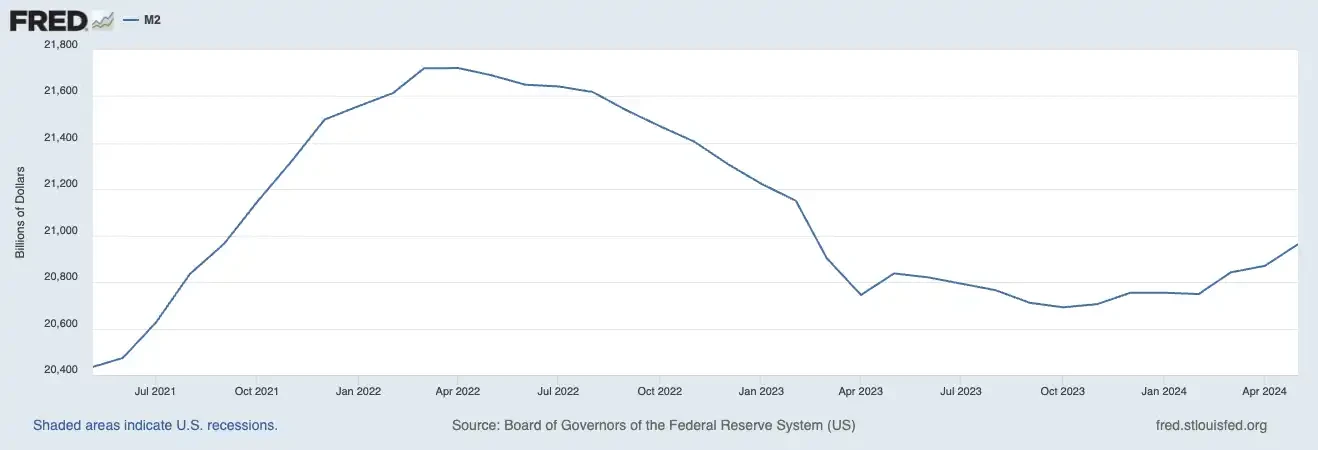 M 2 供应量增长对比特币有利,因为它增加了经济流动性。流通中的货币越多,人们就会对比特币等风险较高的资产进行更多投资,因为储蓄和债券等传统投资的回报率较低。