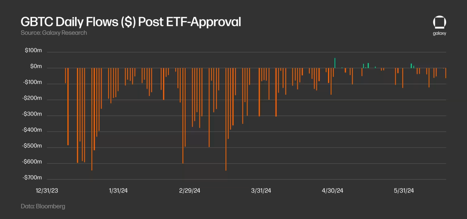 GBTC 交易的解除对整体 ETF 流入造成了影响。 自将信托转换为 ETF 以来,GBTC 在前几个月经历了显著的流出。GBTC 的每日流出在 3 月中旬达到峰值, 3 月 18 日的流出额为 6.42 亿美元。自那以后,流出有所缓和,GBTC 自 5 月起甚至出现了几天的净流入(在 5 月 3 日首次出现净流入之前有 78 天的流出)。截至 6 月 15 日,自 ETF 启动以来,GBTC 持有的 BTC 余额从 61.9 万 BTC 减少到 27.8 万 BTC(减少了 55% )。