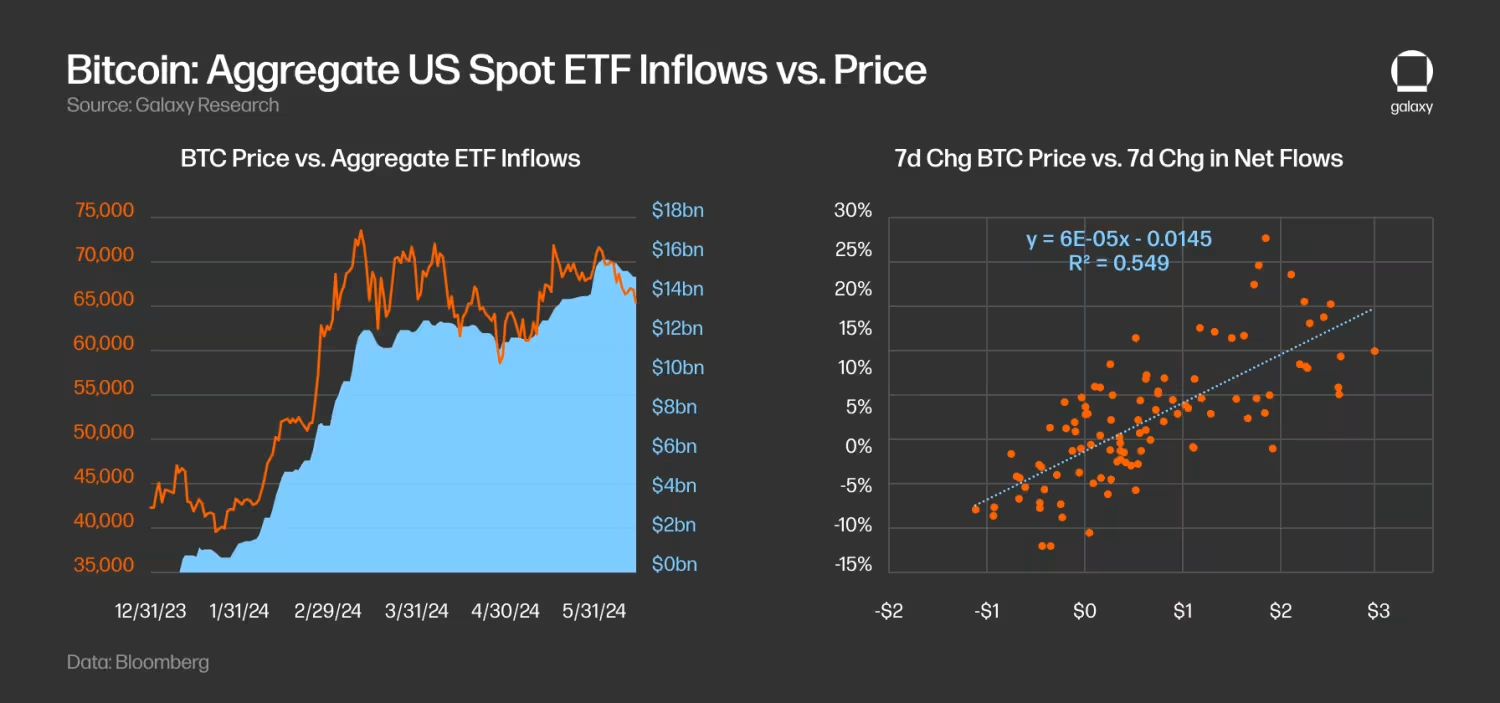 ETF 的流入部分推动了 BTC 的价格上涨。 通过回归 BTC 价格和 ETF 净流入的一周变化,我们计算得出 r-sq 为 0.55 ,表明这两个变量高度相关。有趣的是,我们还发现价格变化比流入更能作为流入的领先指标。