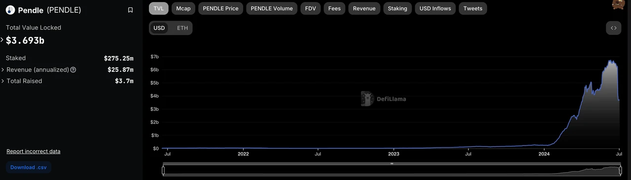 尽管自 2024 年 6 月 27 日开始 Pendle 的 TVL 发生了大幅下降,但是总 TVL 依然维持 30 亿美元左右,在 Defi 领域位居前列。