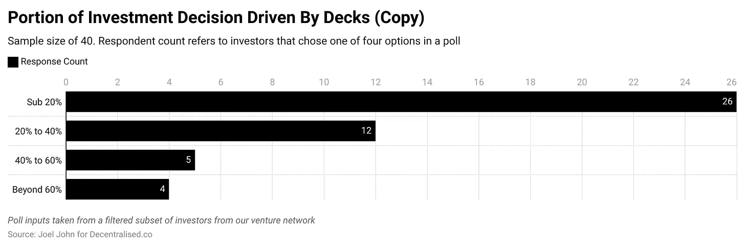 在撰写这篇文章之前,我向两组投资者提出了同样的问题:“在种子阶段,你的投资决策中有多少是由 PPT 决定的?”回答各不相同。Primitive Ventures 的 Dovey Wan 在我们的 风险投资社区 中指出,种子阶段的投资就像第一次约会,主要是凭感觉。Multicoin 的 Kyle Samani 则认为,大部分筹资是 关于沟通 ,而 PPT 是传达这一点的主要工具。