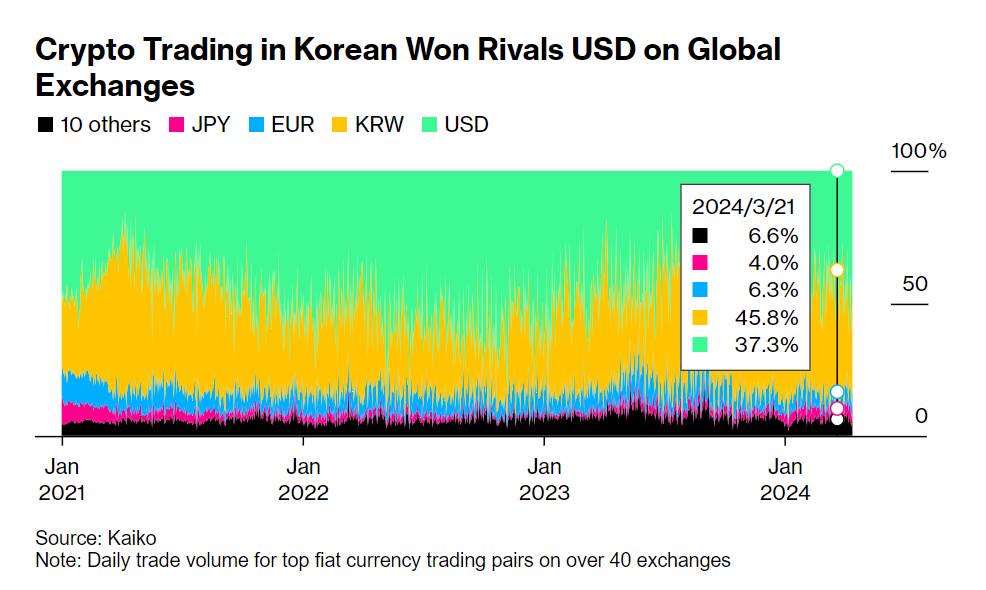 韩国加密货币市场的重要性正在与日俱增。 2024 年第一季度,韩元是全球最活跃的对加密资产交易货币,超过美元。研究公司 Kaiko 的数据显示, 2024 年第一季度,韩元在中心化加密货币交易所的累计交易额为 4560 亿美元,而美元交易额为 4450 亿美元。